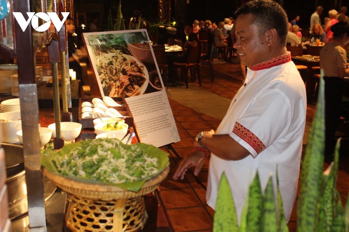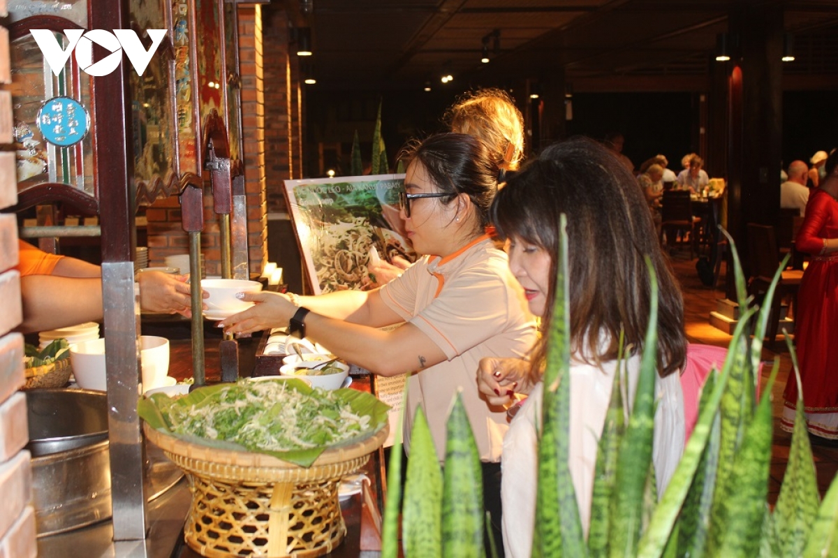 Du khách nước ngoài thưởng thức món ăn truyền thống của người Chăm