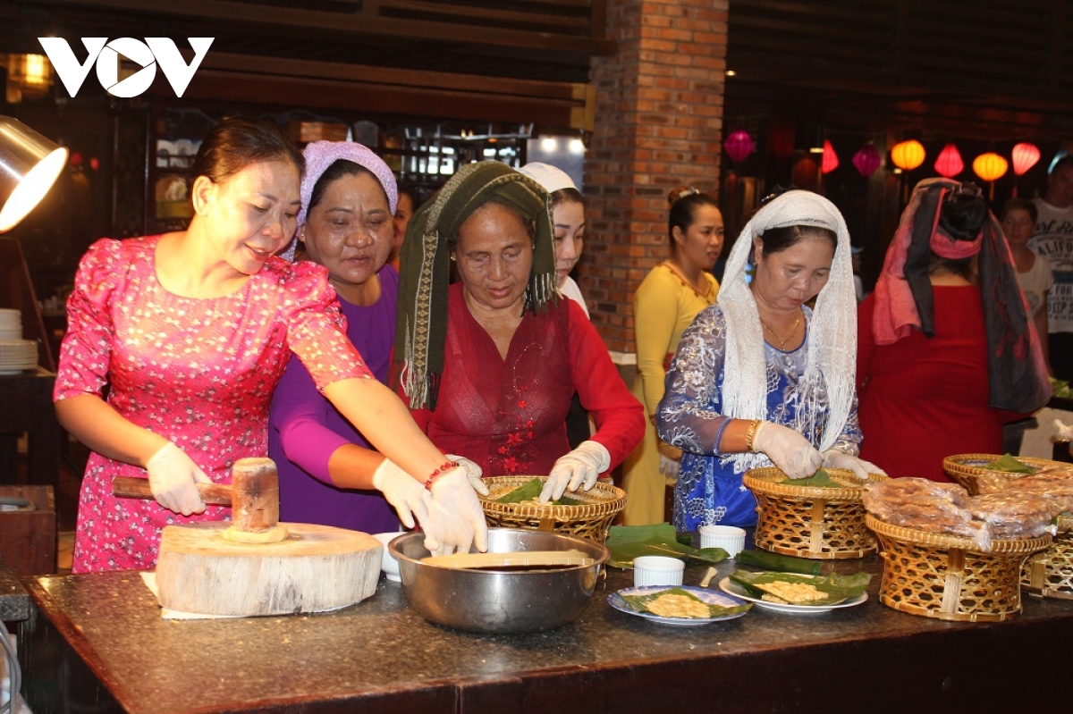 Các nghệ nhân Chăm đang làm bánh gừng - loại bánh truyền thống của người Chăm