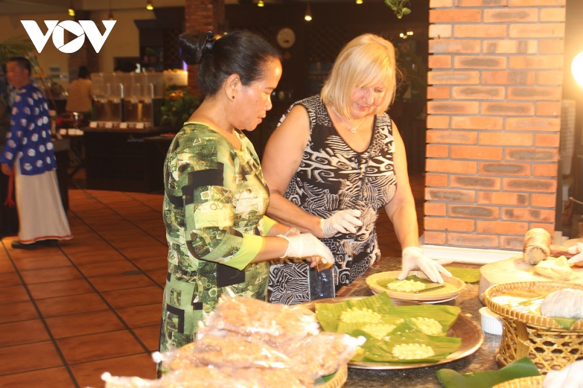 Du khách nước ngoài thích thú trải nghiệm làm món bánh truyền thống của đồng bào Chăm