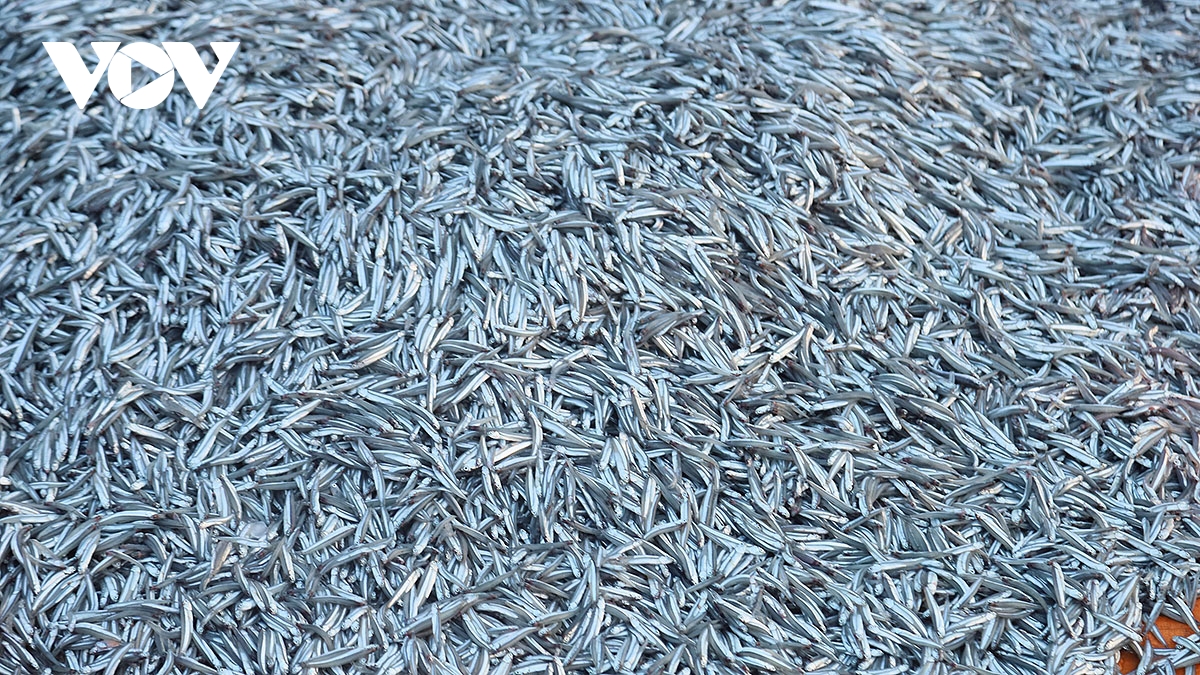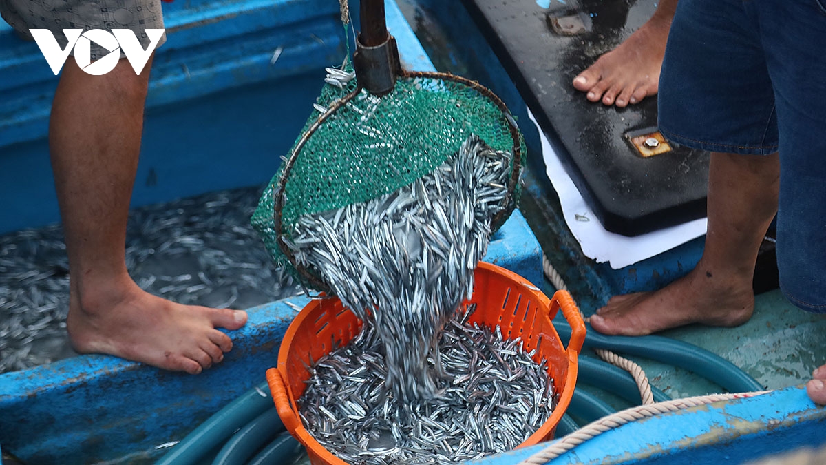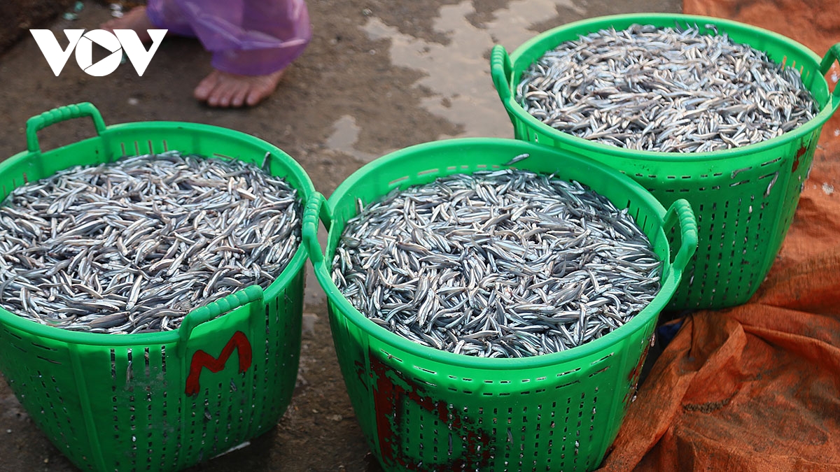Cá cơm được đánh bắt đưa vào bờ để bán cho thương lái.