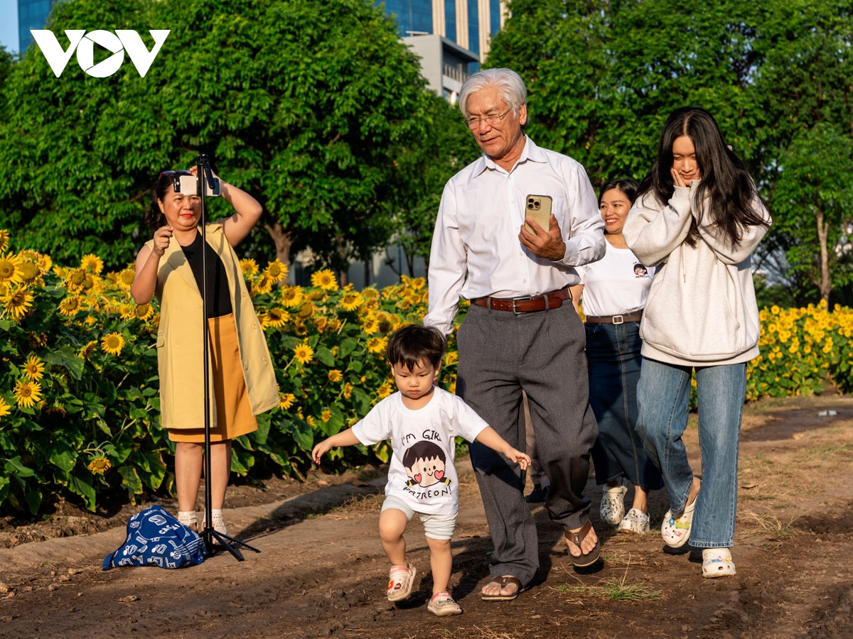 Hoa hướng dương nở vàng rực rỡ, cảnh đẹp như tranh vẽ không chỉ thu hút giới trẻ mà nhiều người lớn tuổi cũng thích thú, tranh thủ đến đây từ sáng sớm để thưởng ngoạn.
