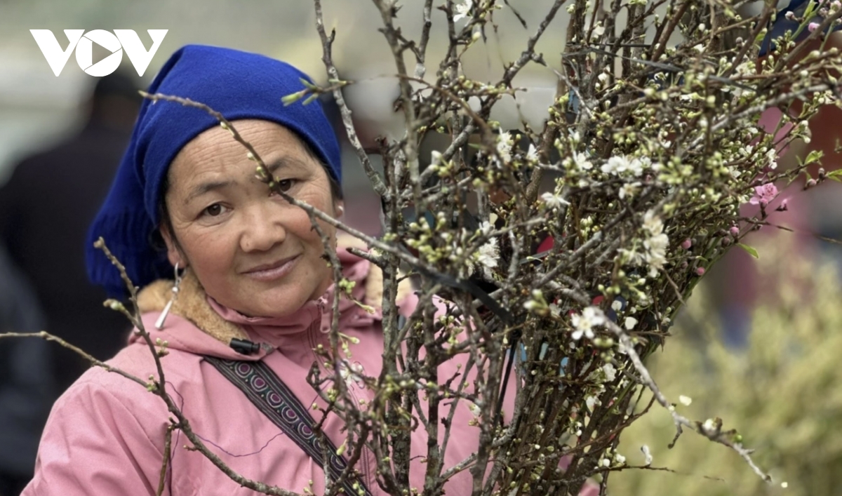 Wild peach branches brought to the market by local residents signal the arrival of spring in the Bac Ha highlands.