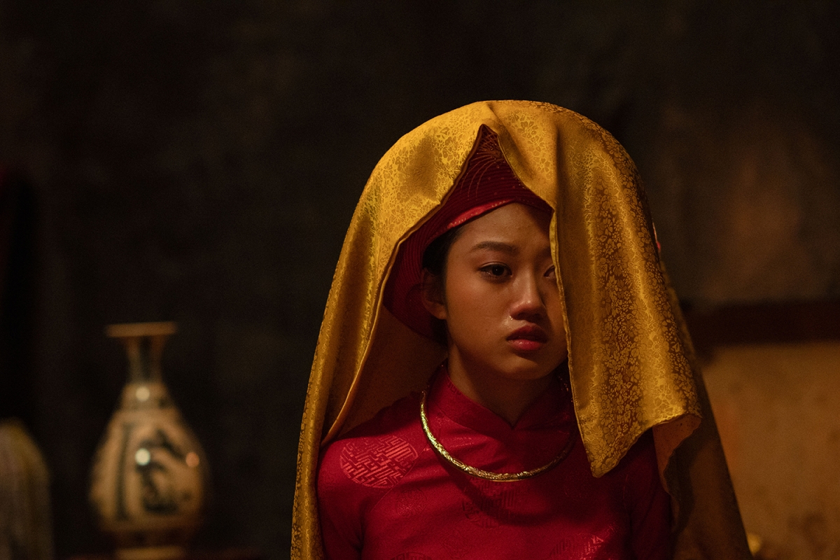 Trong những hình ảnh hậu trường, Mai Cát Vi lại khoe vẻ duyên dáng, dịu dàng trong tà áo dài đỏ, ngồi một mình trong phòng tân hôn phủ ánh sáng vàng ấm áp, gương mặt trầm tư. Cô gái mới về nhà chồng này mang đến cảm xúc trưởng thành bất ngờ cho một diễn viên 16 tuổi.