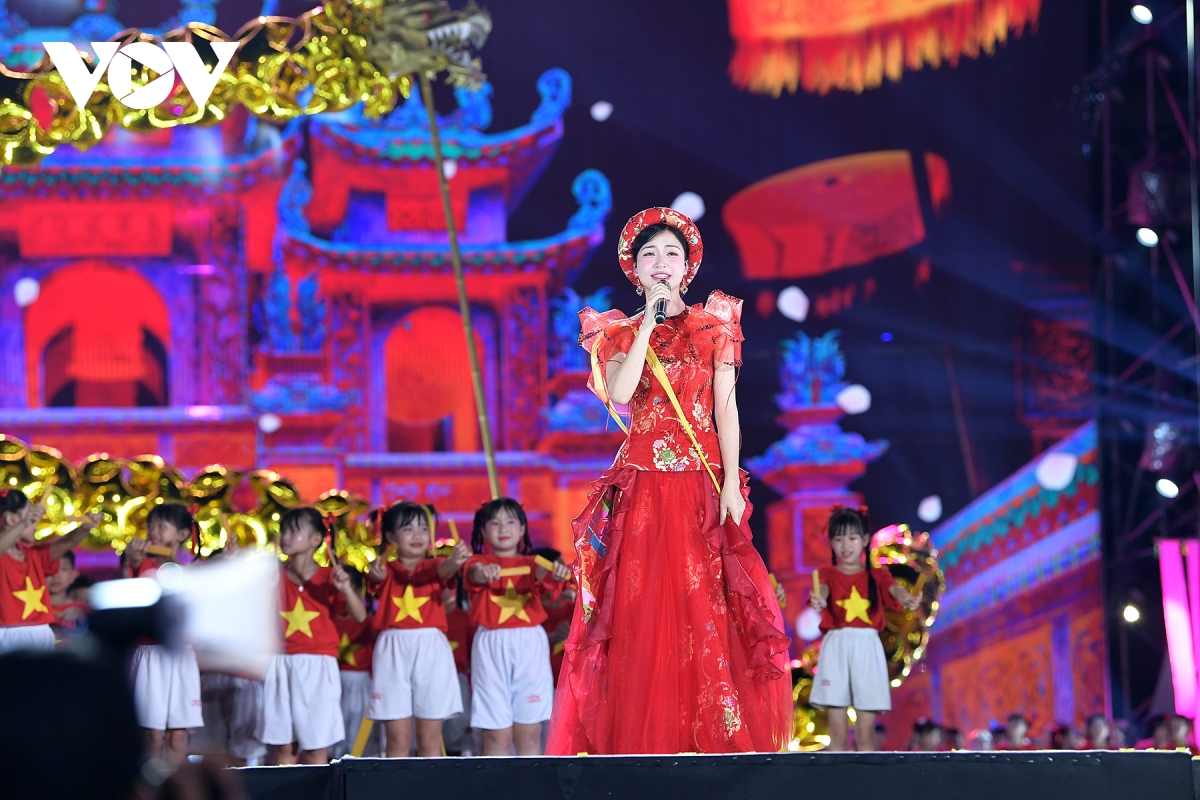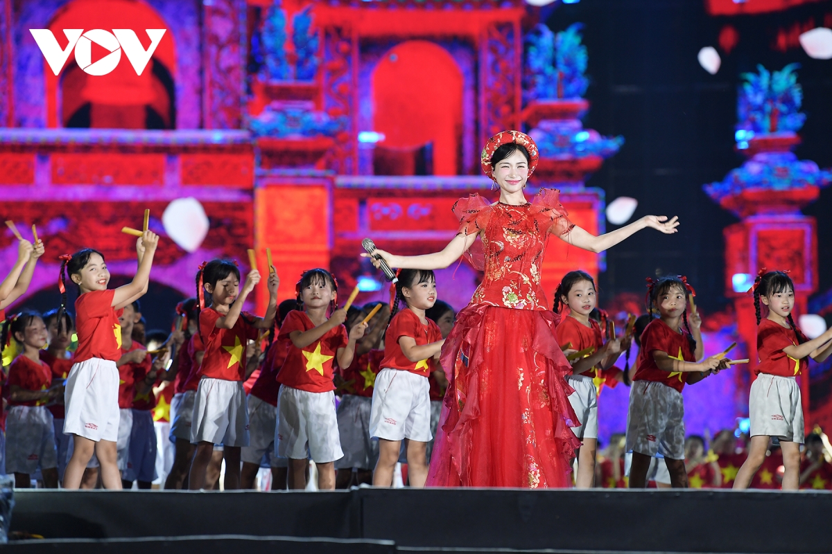 Trước đó, Hòa Minzy mang đến nhiều cung bậc cảm xúc khi tham gia tiết mục Bắc Bling cùng 200 em nhỏ Lạc Xá (quê hương Bắc Ninh của cô), đồng thanh “Bắc Ninh xin chào”. Nghệ sĩ chia sẻ: “Hôm nay là ngày đặc biệt, ngày tôn vinh văn hóa dân tộc”. Cô mang tới 1.000 con tò he – món đồ chơi dân gian quen thuộc – đến đại nhạc hội, như một lời tri ân văn hóa truyền thống. Ảnh: BTC