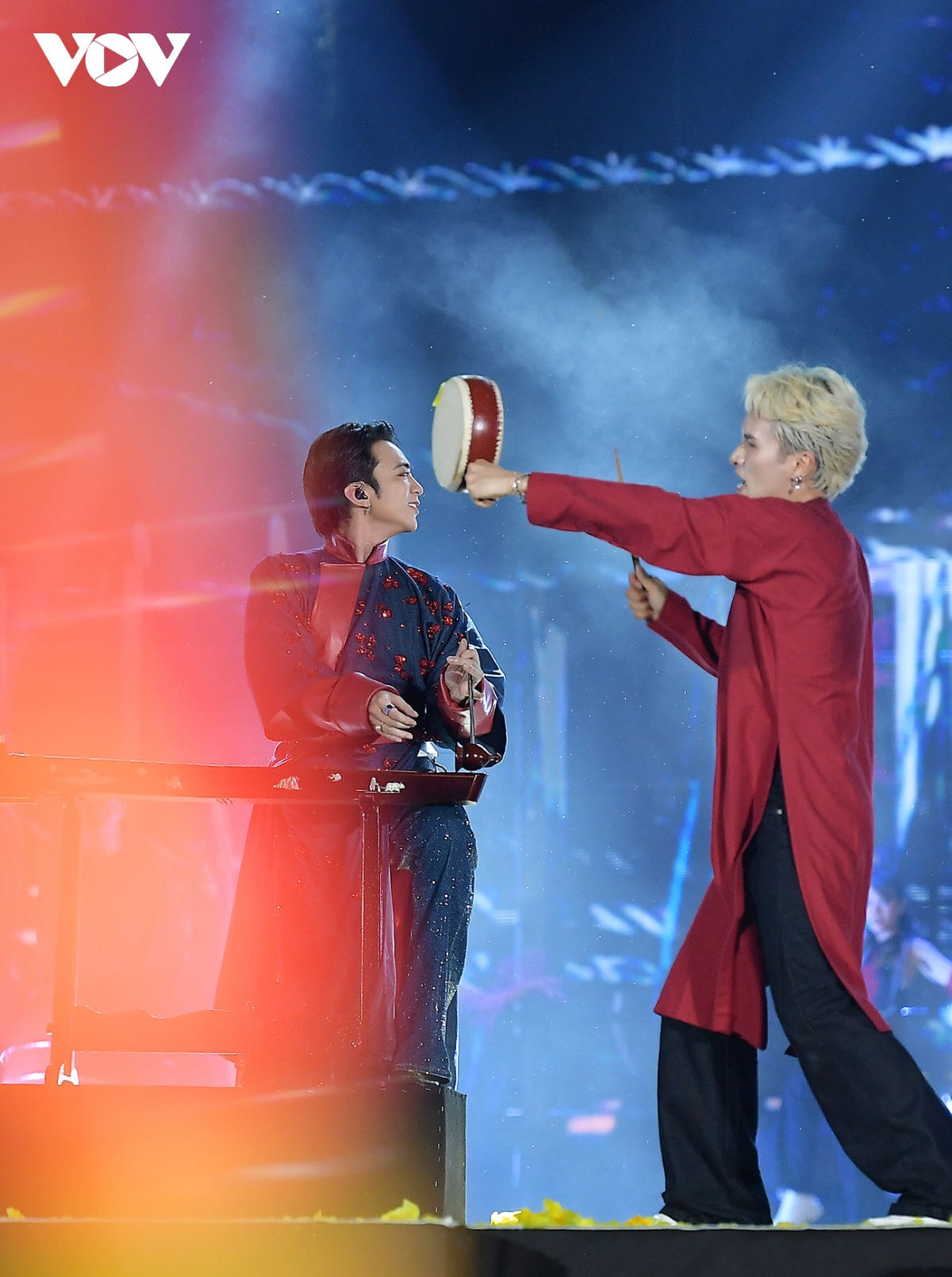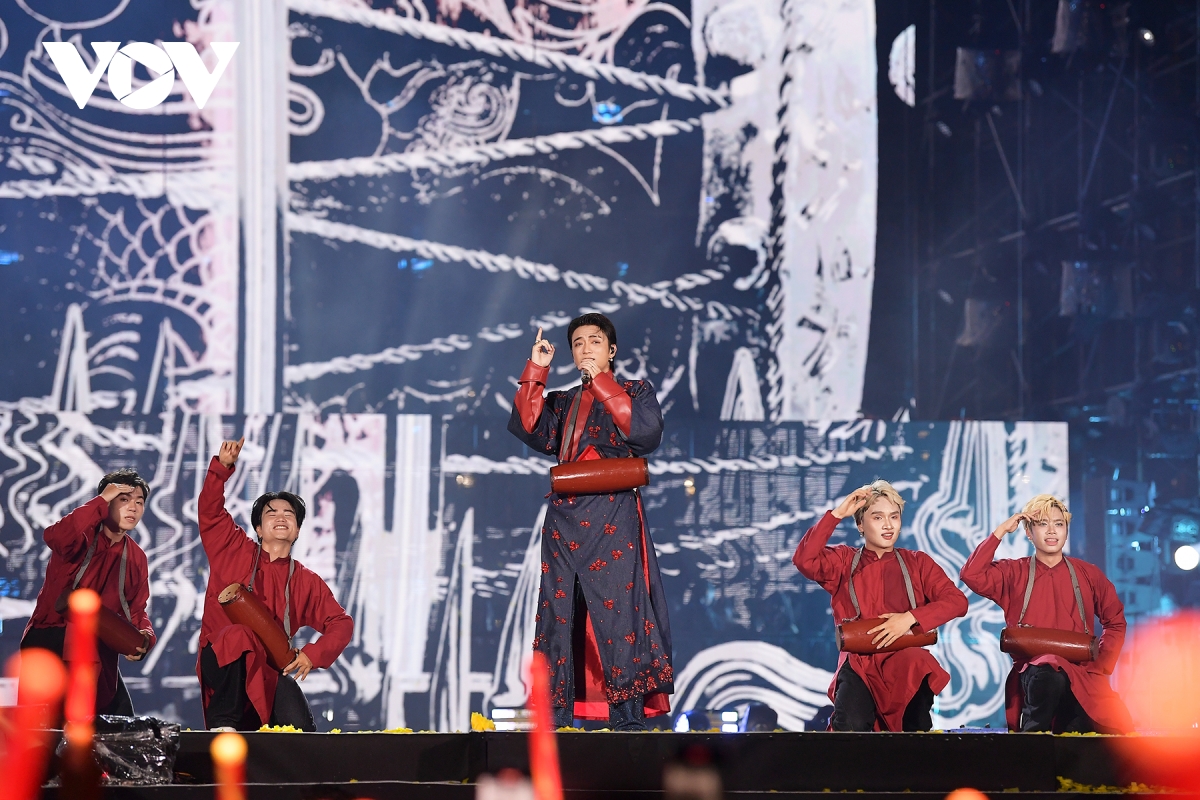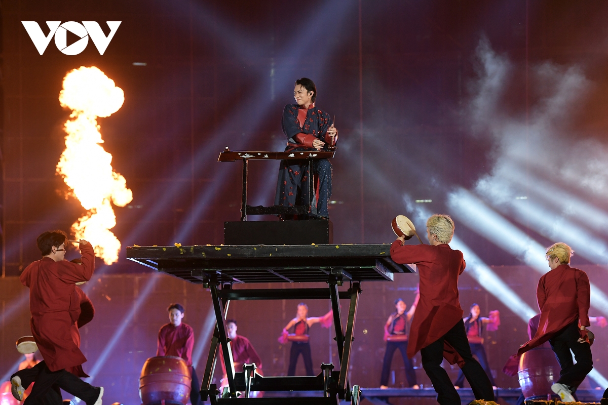 Không khí càng thêm sôi động khi Soobin trình diễn mashup Trống cơm – Người Việt, lồng ghép những từ khóa quen thuộc: “người Việt”, “hào kiệt”, “cuồng nhiệt” và “dậy mà đi”. Phần trình diễn không chỉ là âm nhạc, mà còn như lời nhắn nhủ về niềm tự hào và sức mạnh tinh thần dân tộc.