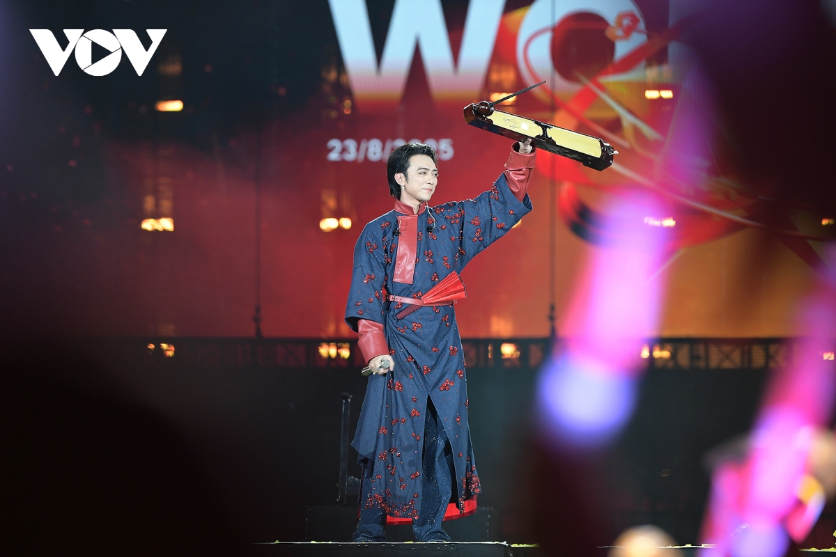 Cao trào cảm xúc đến khi Soobin bất ngờ mang tặng khán giả một cây đàn bầu có chữ ký. Khoảnh khắc đó, khán đài như nổ tung trong sự phấn khích.