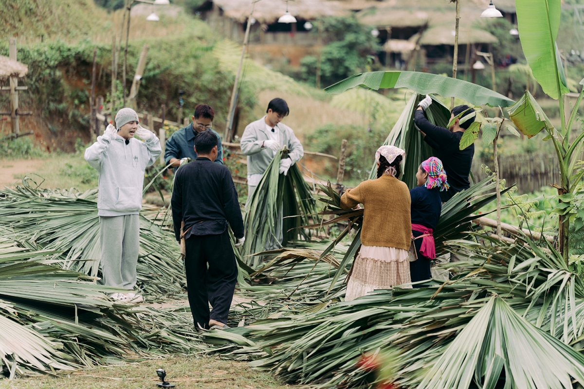 Trở lại bản Liền, những công việc “chân lấm tay bùn” tiếp tục là phần không thể thiếu. Không còn lúng túng như thuở ban đầu, các thành viên bắt nhịp nhanh và tự tin với kinh nghiệm tích lũy. Anh Cả Thuận và Út Khánh hào hứng khẳng định: “Không còn là nông dân tập sự nữa, giờ mình đã là nông dân chuyên nghiệp rồi”. Cả nhóm nhanh chóng bắt tay vào công đoạn xẻ lá, dùng dao tách từng tàu cọ lớn, tỉ mẩn chuẩn bị những bó nguyên liệu để anh Hà và chị Thông lợp lại mái nhà. Anh chị hàng xóm, họ hàng nhà chị Thông cũng đến góp sức để cùng đan tre và lợp mái.