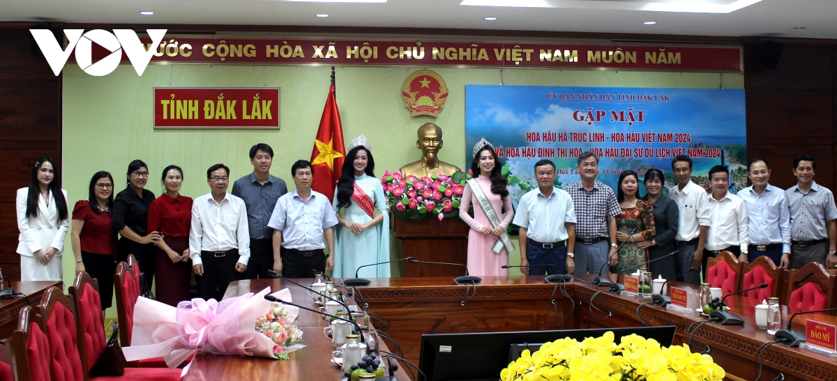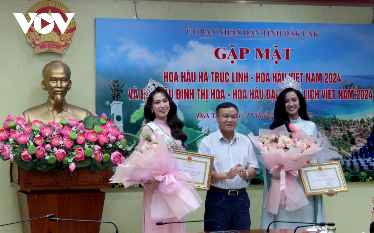 VOV.VN - Sáng 18/7, UBND tỉnh Đắk Lắk tổ chức gặp mặt, khen thưởng Hoa hậu Việt Nam 2024 Hà Trúc Linh và Hoa hậu Đại sứ Du lịch Việt Nam 2024 Đinh Thị Hoa nhân dịp 2 người đẹp này có chuyến thăm quê và thực hiện các hoạt động quảng bá văn hóa, nghệ thuật tại địa phương.