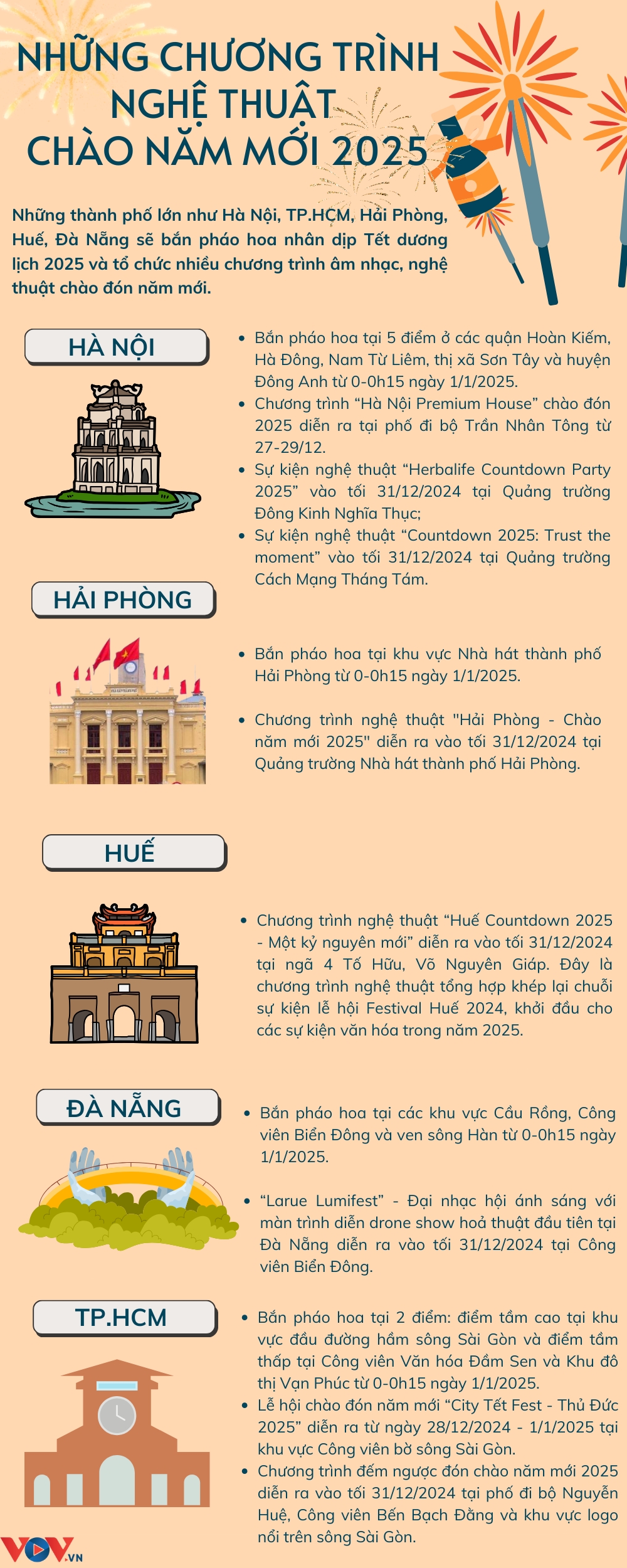 VOV.VN - Những thành phố lớn như Hà Nội, TP.HCM, Hải Phòng, Huế, Đà Nẵng sẽ bắn pháo hoa nhân dịp Tết Dương lịch 2025 và tổ chức nhiều chương trình âm nhạc, nghệ thuật chào đón năm mới.