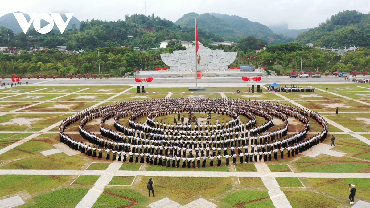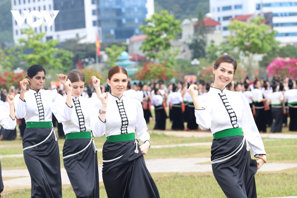 Trong trang phục váy cóm truyền thống của đồng bào dân tộc Thái, các thí sinh cùng 1.000 phụ nữ Sơn La đã tay trong tay, nhảy múa nhịp nhàng quanh đống lửa, tạo nên vòng xòe Thái ấn tượng, độc đáo.