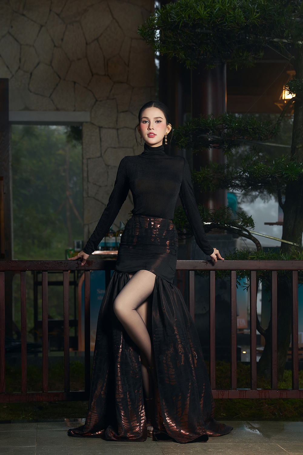 Xuất hiện ở phần mở màn, Á hậu Linh Đan khoác lên mình thiết kế đầm đen với phần thân trên ôm sát, tối giản mà sang trọng. Phần chân váy dài có độ bắt sáng nhẹ, tạo hiệu ứng khi di chuyển và giúp cô khéo léo khoe đôi chân thon dài. Lối catwalk chắc nhịp và uyển chuyển của người đẹp giúp gương mặt trẻ gây ấn tượng ngay những phút đầu show diễn.
