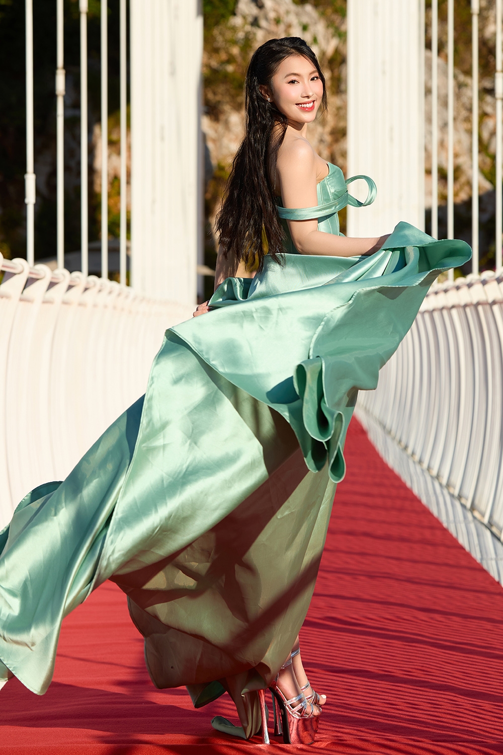 Vòng chung khảo tài năng cuộc thi Hoa hậu Du lịch Dân tộc Việt Nam 2025 gây bất ngờ và để lại ấn tượng mạnh mẽ khi được tổ chức ngay trên cầu kính Bạch Long - một trong những cây cầu kính nổi tiếng bậc nhất Việt Nam. Phần trình diễn thời trang này mang đến “cảm xúc mạnh” bởi mặt cầu bằng kính trong suốt cho phép nhìn thấu vực sâu và cảnh quan bên dưới, tạo nên ảo giác độ cao đặc trưng.