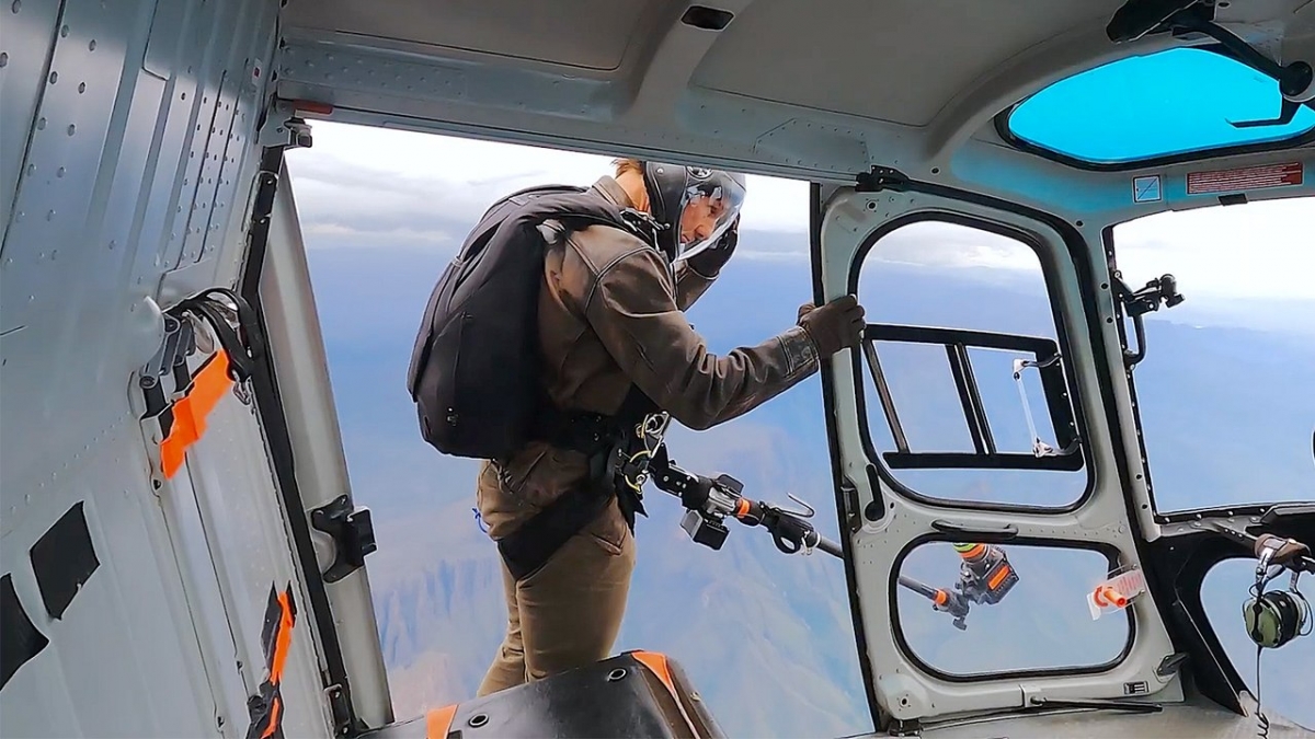 Một trong những cảnh nguy hiểm nhất trong sự nghiệp của Cruise xuất hiện ở phần mới này: anh đeo Snorricam – loại camera gắn trực tiếp trên người – và nhảy từ độ cao hơn 3.000 mét với vận tốc rơi ngày càng nhanh. Không có mũ bảo hiểm, không lưới đỡ, chỉ có một chiếc camera được Cruise tùy chỉnh góc quay, tiêu cự để đạt được hiệu ứng chân thực đến nghẹt thở. Đạo diễn hành động Wade Eastwood xác nhận: “Không có cách nào ghi hình được những góc máy như vậy nếu không có Tom Cruise. Anh ấy đã kết hợp kỹ năng phi công, tư duy điện ảnh và lòng quả cảm vào một”.