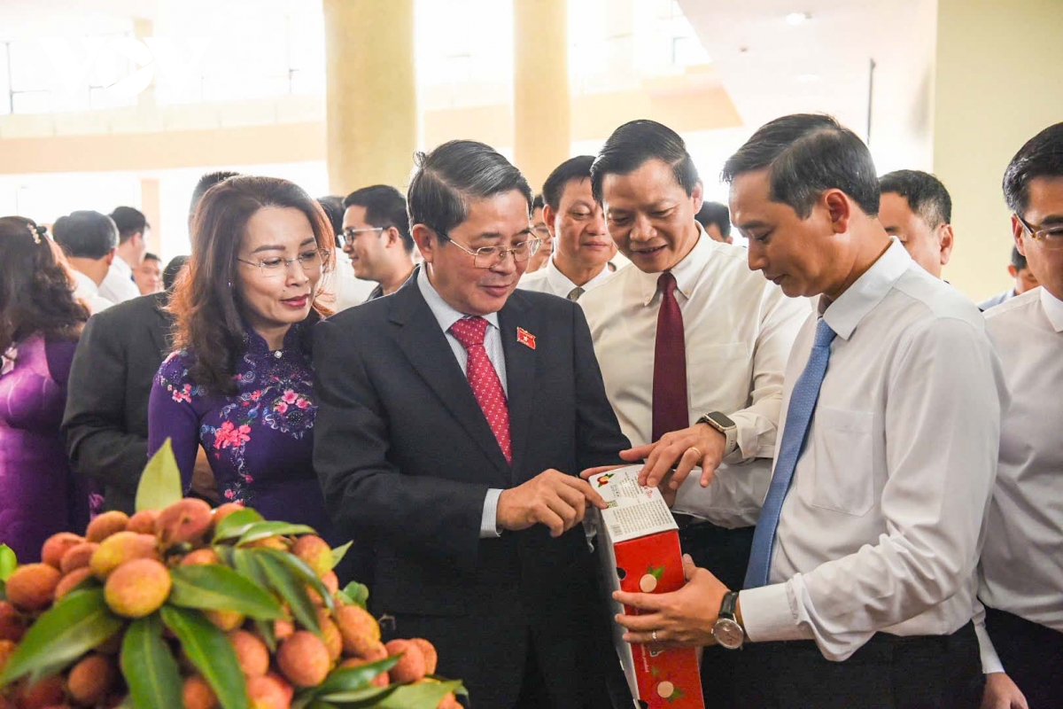 Phó Chủ tịch Quốc hội Nguyễn Đức Hải cùng lãnh đạo tỉnh Bắc Giang, tỉnh Bắc Ninh tham quan gian hàng trưng bày vải thiều