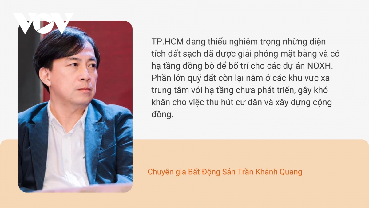 Chuyên gia bất động sản Trần Khánh Quang nhận định, TP.HCM đang phải đối mặt với thách thức về quỹ đất. Thành phố thiếu nghiêm trọng những diện tích đất sạch đã được giải phóng mặt bằng và có hạ tầng đồng bộ để bố trí cho các dự án NOXH. Phần lớn quỹ đất còn lại nằm ở các khu vực xa trung tâm với hạ tầng chưa phát triển, gây khó khăn cho việc thu hút cư dân và xây dựng cộng đồng.