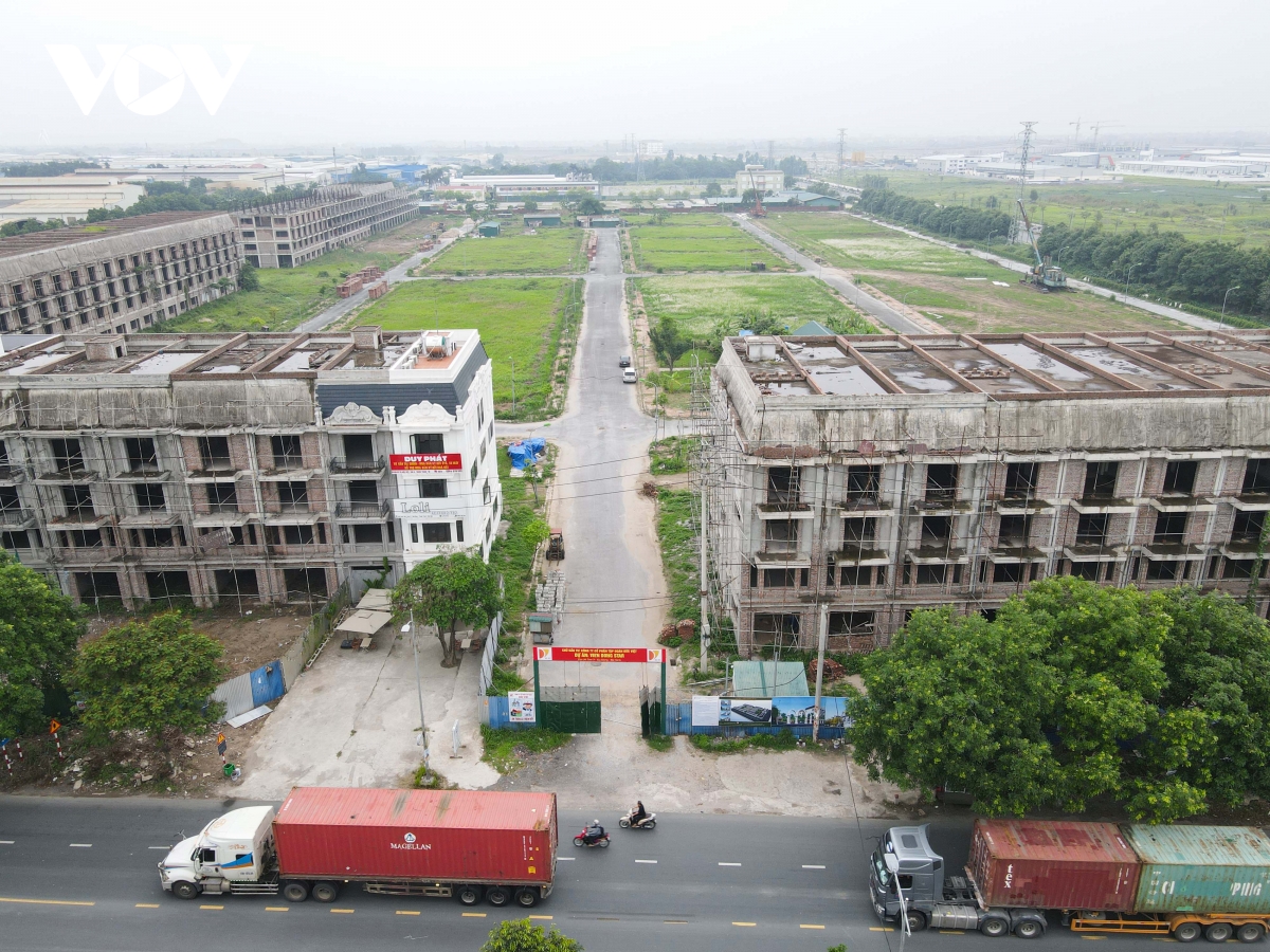 Dãy nhà vị trí mặt đường Thuận Thành 5 vẫn đang thi công dang dở trên một đoạn dài.