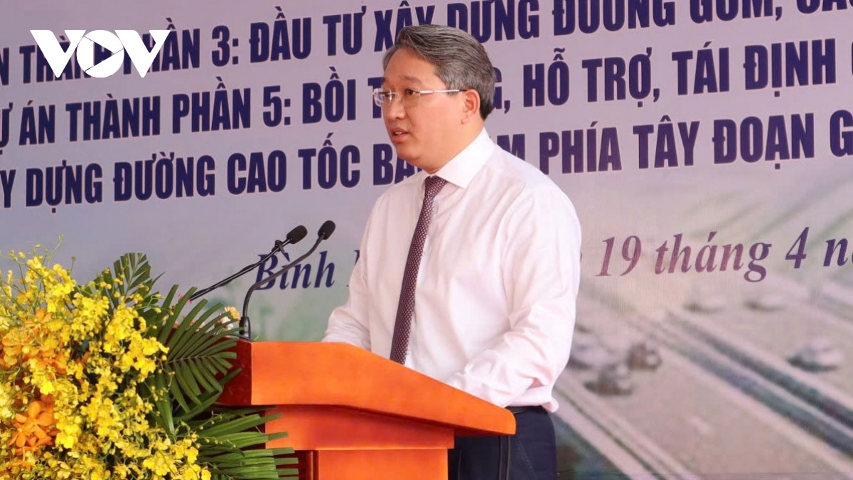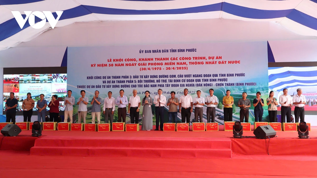 VOV.VN - Sáng 19/4, trong không khí chào mừng kỷ niệm 50 năm Ngày Giải phóng miền Nam, thống nhất đất nước, UBND tỉnh Bình Phước tổ chức Lễ khởi công hai dự án thành phần thuộc Dự án đầu tư xây dựng đường cao tốc Bắc - Nam phía Tây, đoạn Gia Nghĩa (Đắk Nông) - Chơn Thành (Bình Phước).