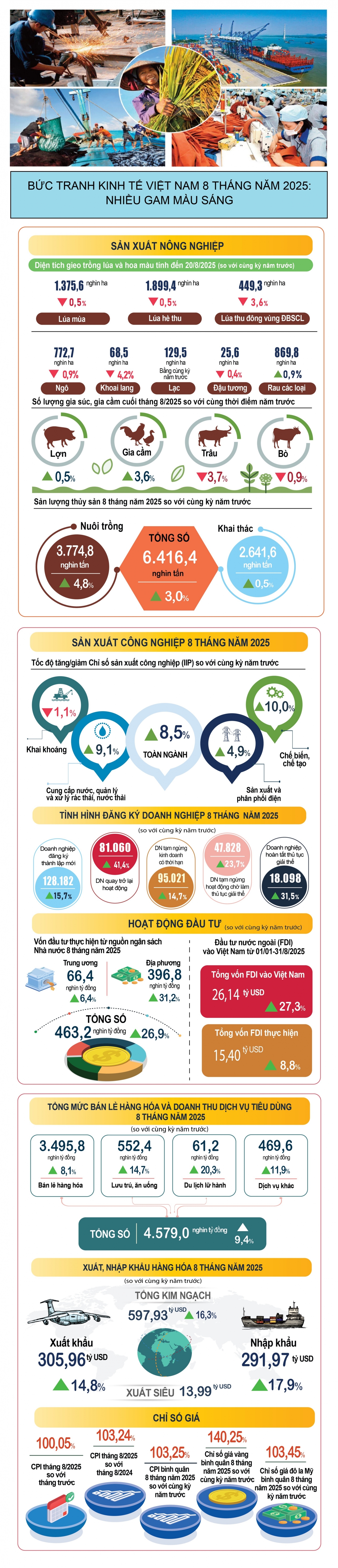 VOV.VN - Dù đối mặt với những thách thức từ bối cảnh toàn cầu, kinh tế Việt Nam 8 tháng qua vẫn ghi nhận tín hiệu tích cực trên nhiều lĩnh vực then chốt. Trong đó, xuất siêu đạt gần 14 tỷ USD, số doanh nghiệp thành lập mới và quay trở lại hoạt động đạt hơn 209.000 doanh nghiệp, tăng 24,5%; vốn FDI thực hiện đạt mức cao nhất trong vòng 5 năm qua...