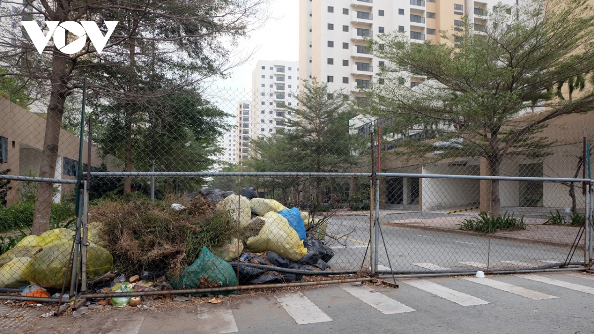 Nội khu đã bị rào chắn không cho người lạ vào. Vậy nhưng rác thải đang chất thành đống ngổn ngang trông nhếch nhác.
