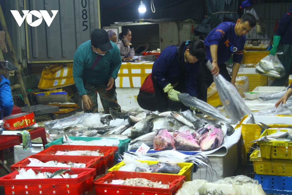 Không khí mua bán hải sản nhộn nhịp từ lúc 2h sáng tại cảng cá Nhật Lệ, thành phố Đồng Hới, tỉnh Quảng Bình. 5 tàu cá vừa cập bến mang theo nhiều loại hải sản, trên bờ các thương lái đã đợi sẵn để mua.