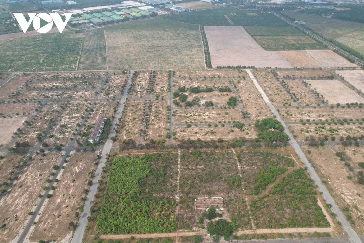 Di chuyển thêm 3km, phóng viên phát hiện một dự án bất động sản của công ty BĐS rộng 150 hecta, được triển khai từ năm 2007. Trước đây, chủ đầu tư từng quảng cáo đây sẽ là khu đô thị phồn hoa, thu hút hàng trăm đến hàng ngàn cư dân. Tuy nhiên, hiện tại, dự án vẫn chỉ là những bãi đất trống ngổn ngang, là nơi đất chăn trâu, thả bò đúng nghĩa đen. Tấm biển giới thiệu dự án đã hoen ố, đổ nát, trong khi căn nhà mẫu cũng trở nên điêu tàn, hoang phế. Người bảo vệ duy nhất của dự án cho biết nhiều năm qua chỉ có mình ông trông coi nơi này.
