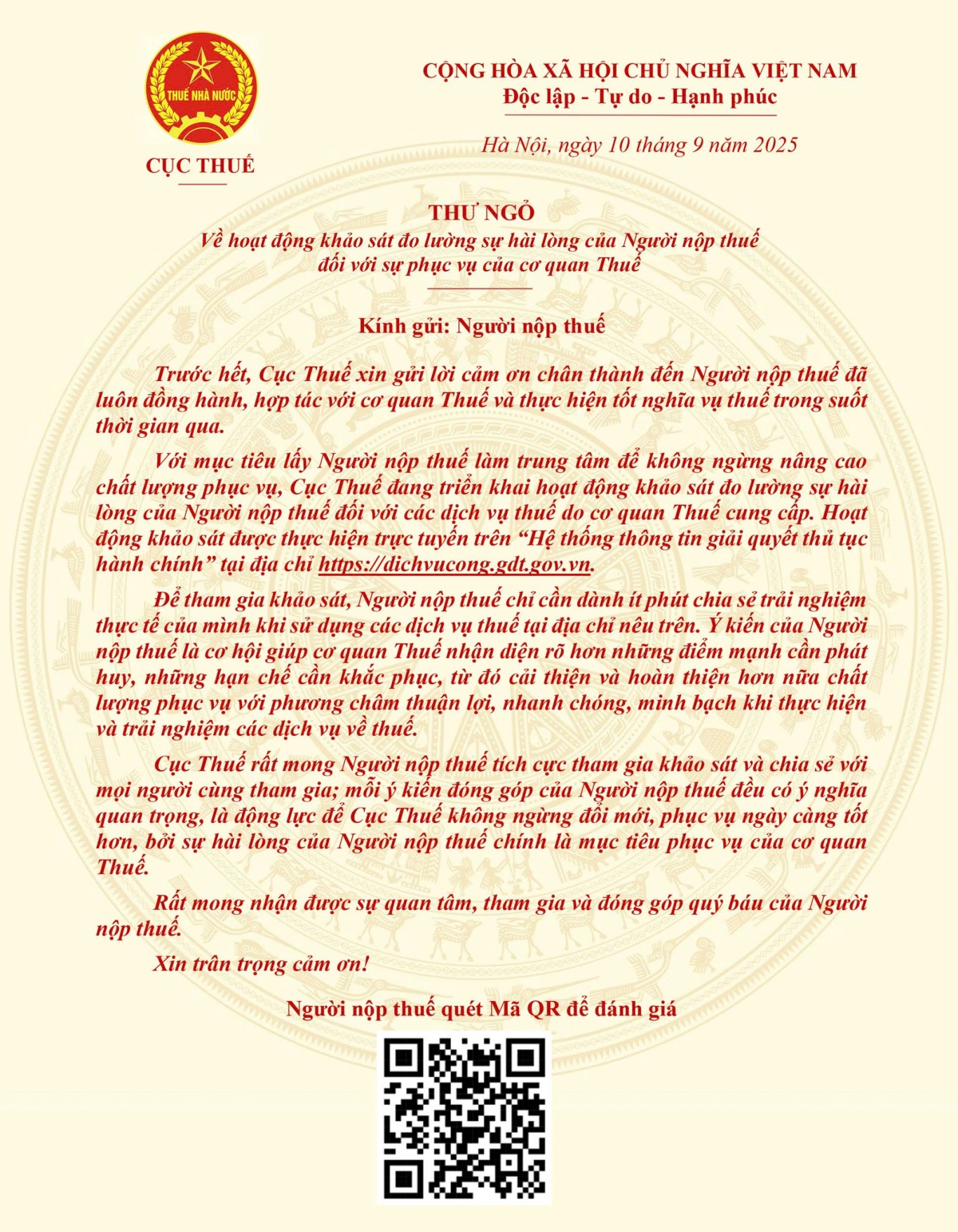 Nội dung Thư ngỏ cho biết, Cục Thuế đang triển khai hoạt động khảo sát đo lường sự hài lòng của người nộp thuế đối với các dịch vụ thuế do cơ quan Thuế cung cấp. Hoạt động khảo sát được thực hiện trực tuyến trên “Hệ thống thông tin giải quyết thủ tục hành chính” tại địa chỉ https://dichvucong.gdt.gov.vn. Báo Điện tử Tiếng nói Việt Nam xin giới thiệu toàn văn Thư ngỏ: