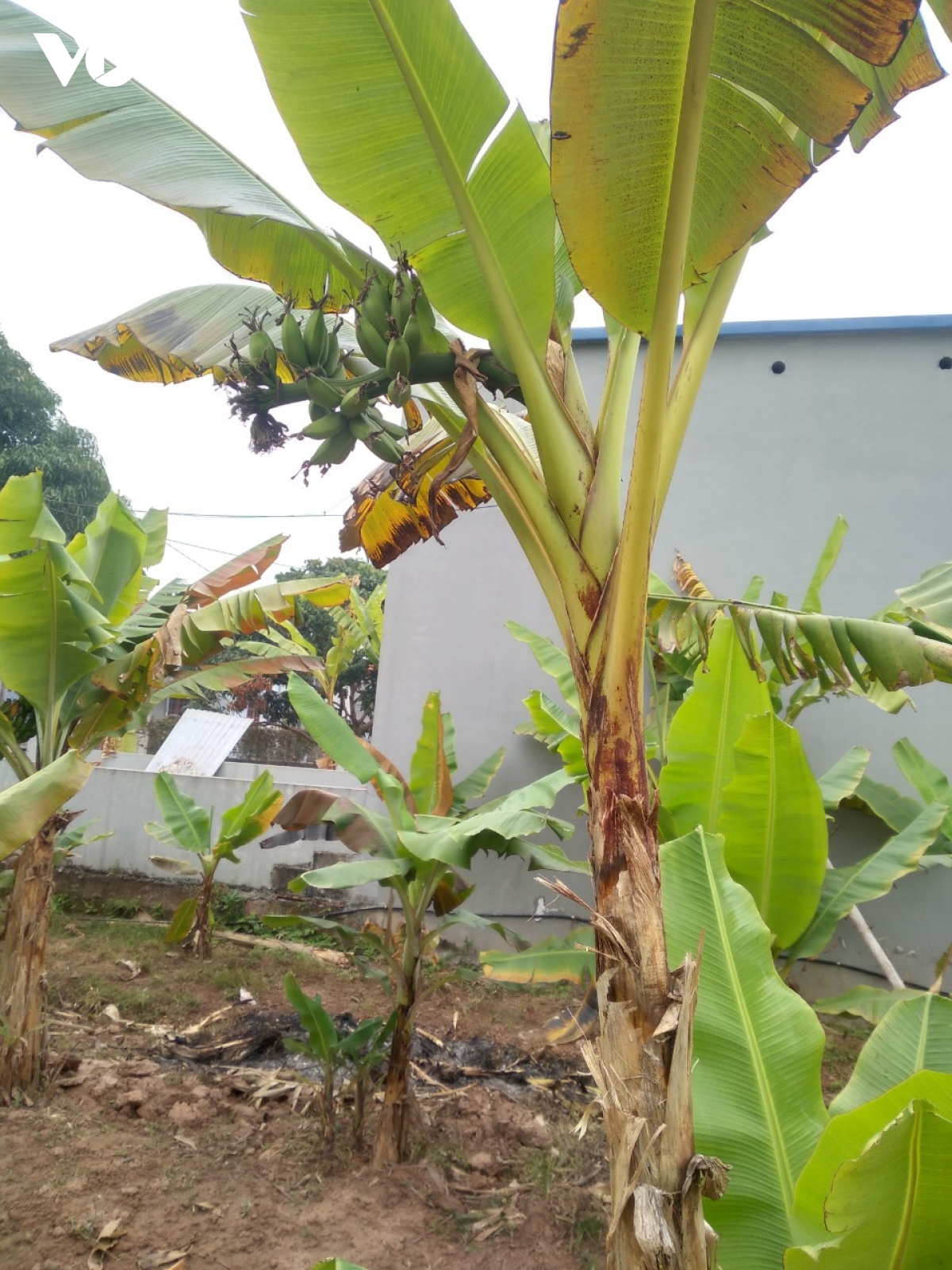 Để chuối nhanh chín, nhà vườn treo những buồng xanh lên giàn, cách mặt đất tầm 1m, ở dưới dùng trấu đốt, lấy hơi nóng “sưởi ấm” cho chuối.