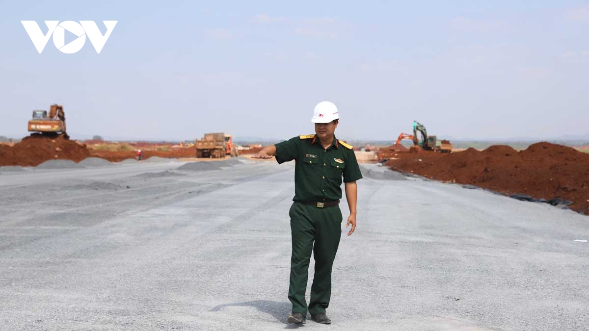 Trung tá Đào Anh Dũng - Giám đốc Ban Điều hành sân bay của Binh đoàn 12 ra công trường kiểm tra tiến độ công trình.