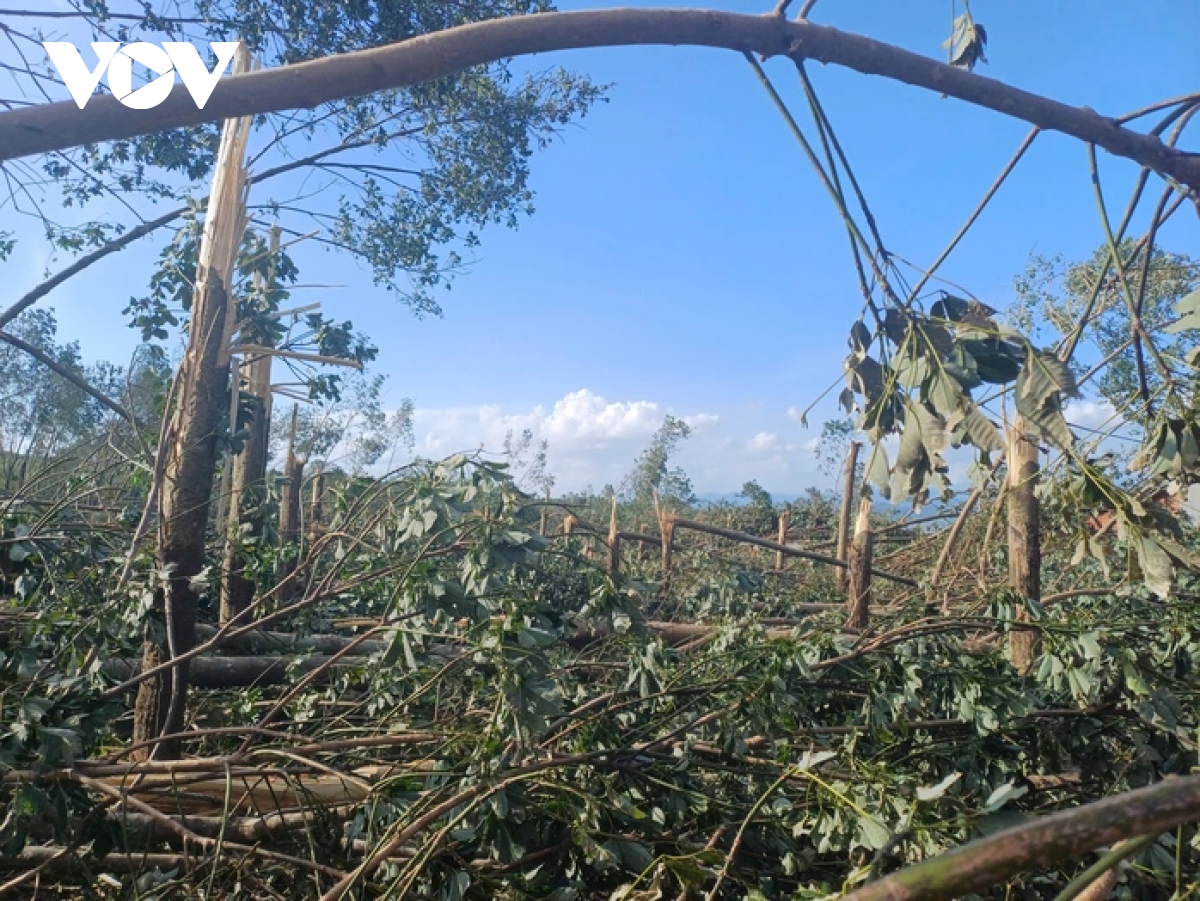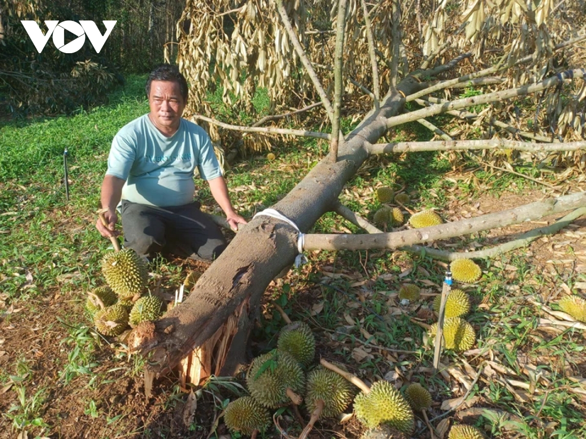 Ông Cao Văn Bính, Trưởng thôn E Đin, xã Ea Bá, tỉnh Đắk Lắk cho biết: “Bà con cũng nóng ruột khi thấy cây ngã đổ. Trước mắt cây cao su gãy đổ thì không khắc phục được. Cây sầu riêng thì bà con đang thuê máy móc để khắc phục dựng lên, nhưng cây đã gãy rồi thì cũng khó mà ổn định được.”