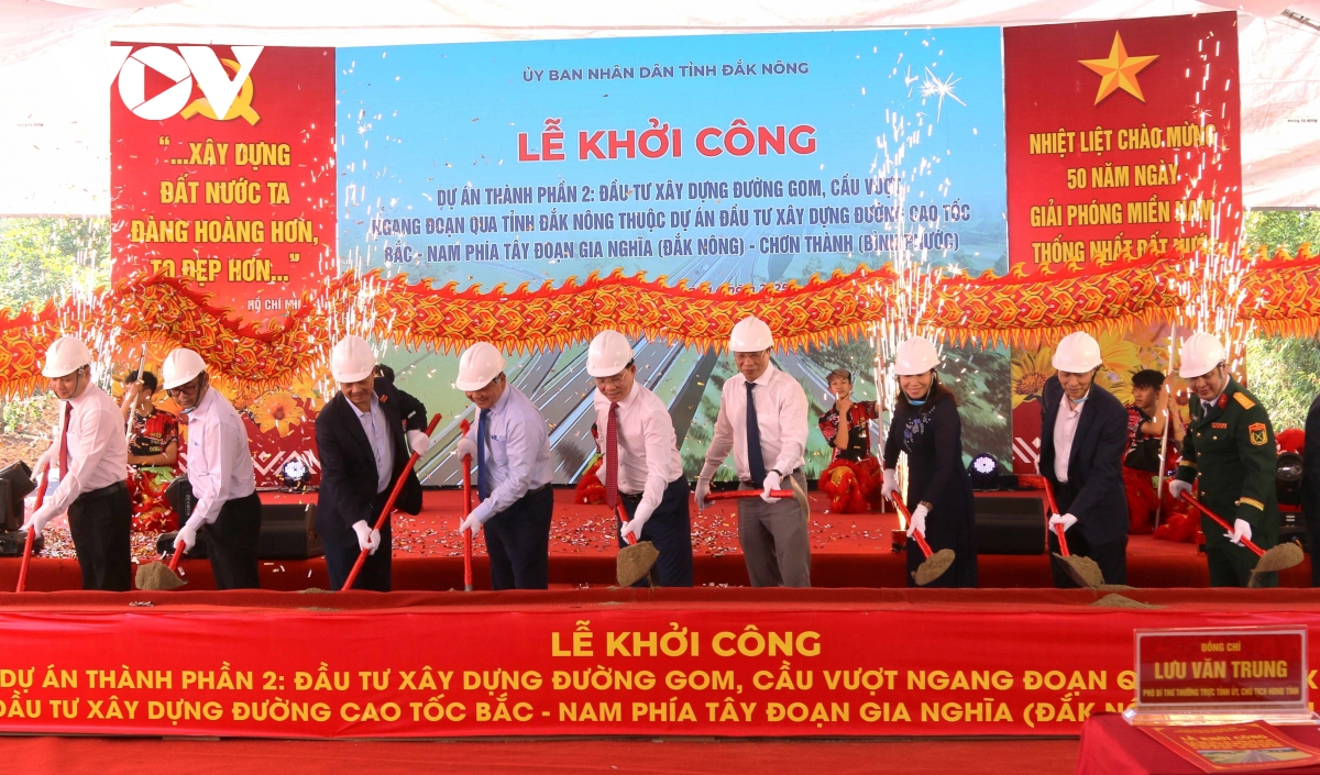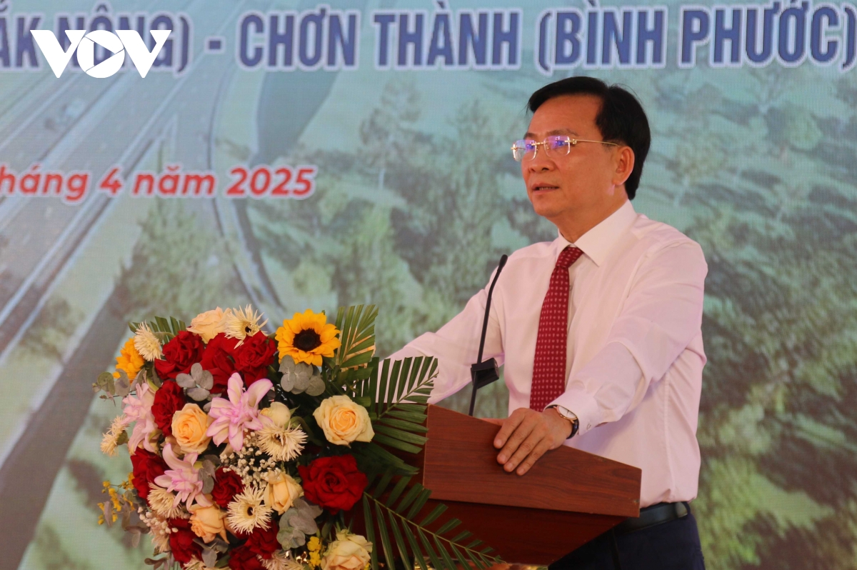 VOV.VN - Sáng 19/4, trong không khí chào mừng kỷ niệm 50 năm Ngày Giải phóng miền Nam, thống nhất đất nước, UBND tỉnh Bình Phước tổ chức Lễ khởi công hai dự án thành phần thuộc Dự án đầu tư xây dựng đường cao tốc Bắc - Nam phía Tây, đoạn Gia Nghĩa (Đắk Nông) - Chơn Thành (Bình Phước).