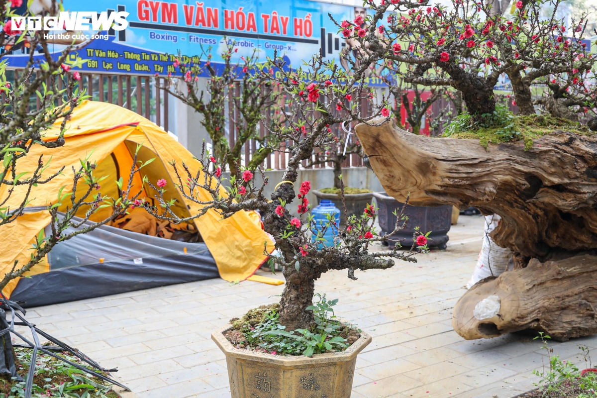 Ngoài cặp đào giá gần 1 tỷ đồng, gian hàng này còn trưng bày hàng chục gốc đào thất thốn với nhiều dáng thế khác nhau.