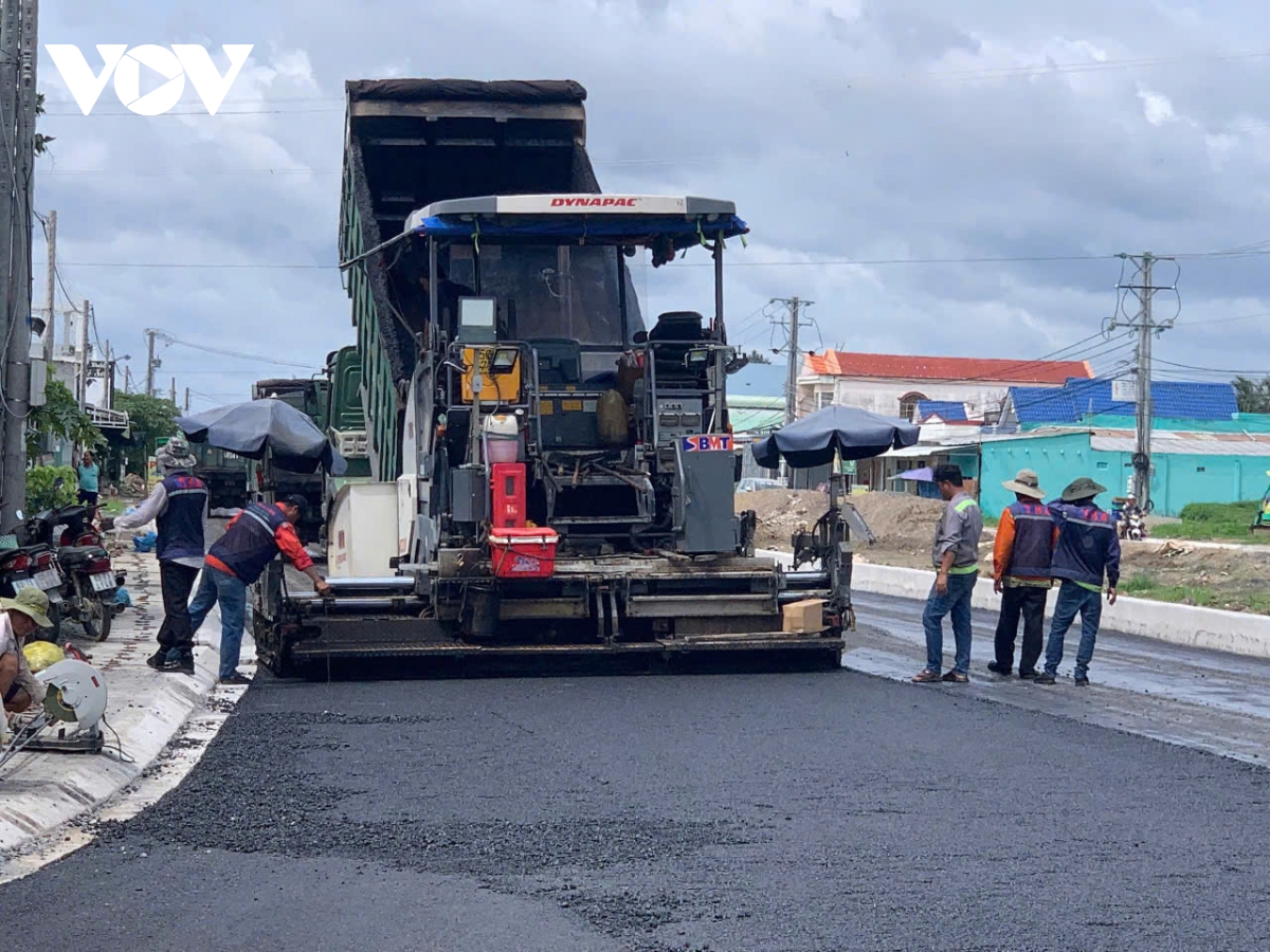 Các đơn vị thi công thực hiện gấp rút các hạng mục cuối cùng của đường dẫn vào cầu Rạch Miễu 2 (phía Tiền Giang)