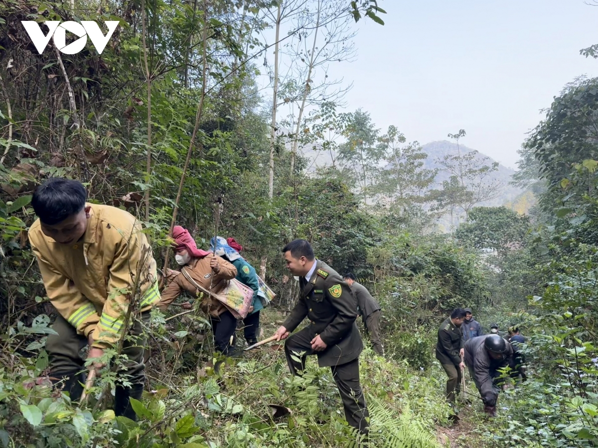 Cán bộ kiểm lâm và người dân Sơn La làm đường băng cản lửa, bảo vệ rừng mua khô hanh.