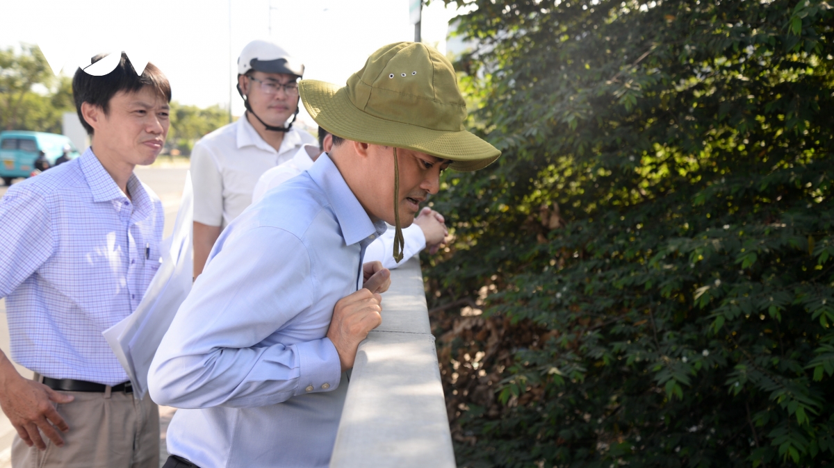 Ông Bùi Xuân Cường kiểm tra thực tế tại khu vực sẽ diễn ra lễ khởi công thuộc phạm vi dự án rạch Xuyên Tâm tại Trường Đại học Văn Lang - thuộc gói thầu XL-03 và khu vực cầu Rạch Lăng trên đường Phạm Văn Đồng.