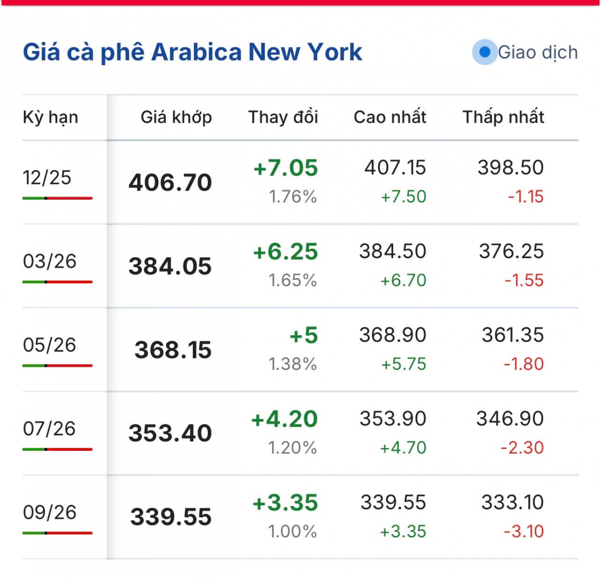 Ở chiều ngược lại, giá cà phê Arabica trên sàn New York kỳ hạn hợp đồng giao tháng 12/2025 đã trở về mức 394,90 US cent/lb, sau khi giảm 1,18%, tương đương tăng 4.75 US cent/lb so với chốt phiên trước.