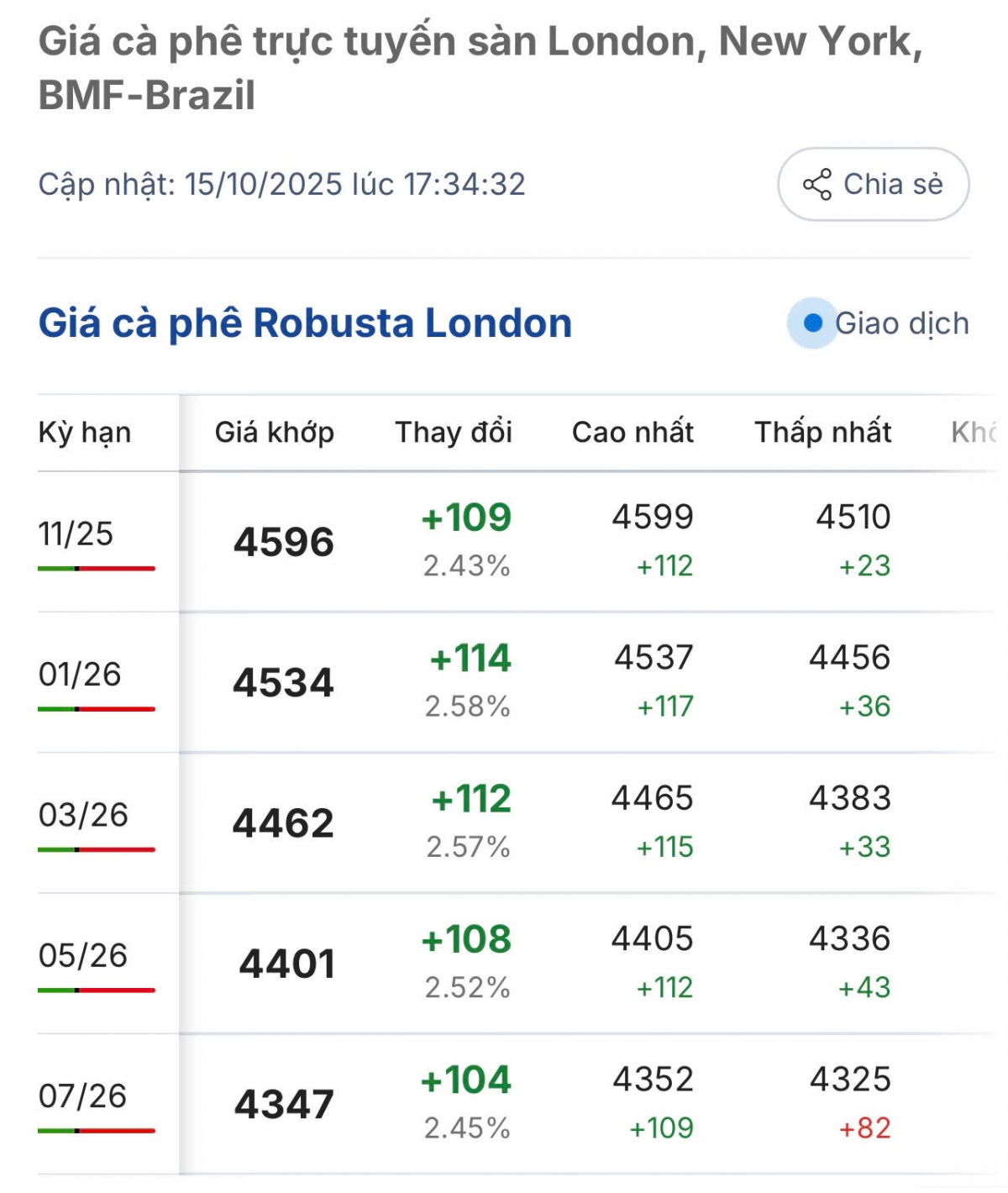 Giá cà phê hôm nay, cuối phiên giao dịch 15/10 (theo giờ Việt Nam), giá cà phê Robusta hợp đồng kỳ hạn giao tháng 11/2025 trên sàn London tăng 2,43%, tương đương 109 USD/tấn, giao dịch ở mức 4.596 USD/tấn.