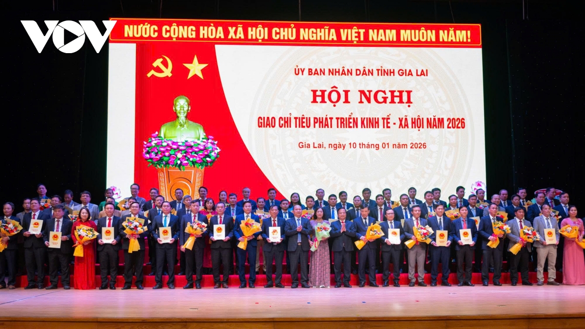 VOV.VN - Chiều 10/1, UBND tỉnh Gia Lai tổ chức hội nghị giao chỉ tiêu phát triển kinh tế - xã hội năm 2026 cho 135 xã, phường và các ngành. Mục tiêu chung là các ngành, địa phương đều phải tăng trưởng 8,8% trở lên.