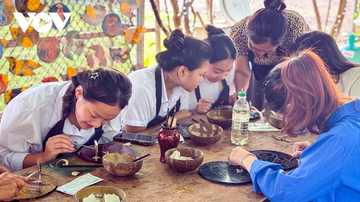 Du khách tham gia hoạt động trải nghiệm làm sản phẩm sơn mài thủ công