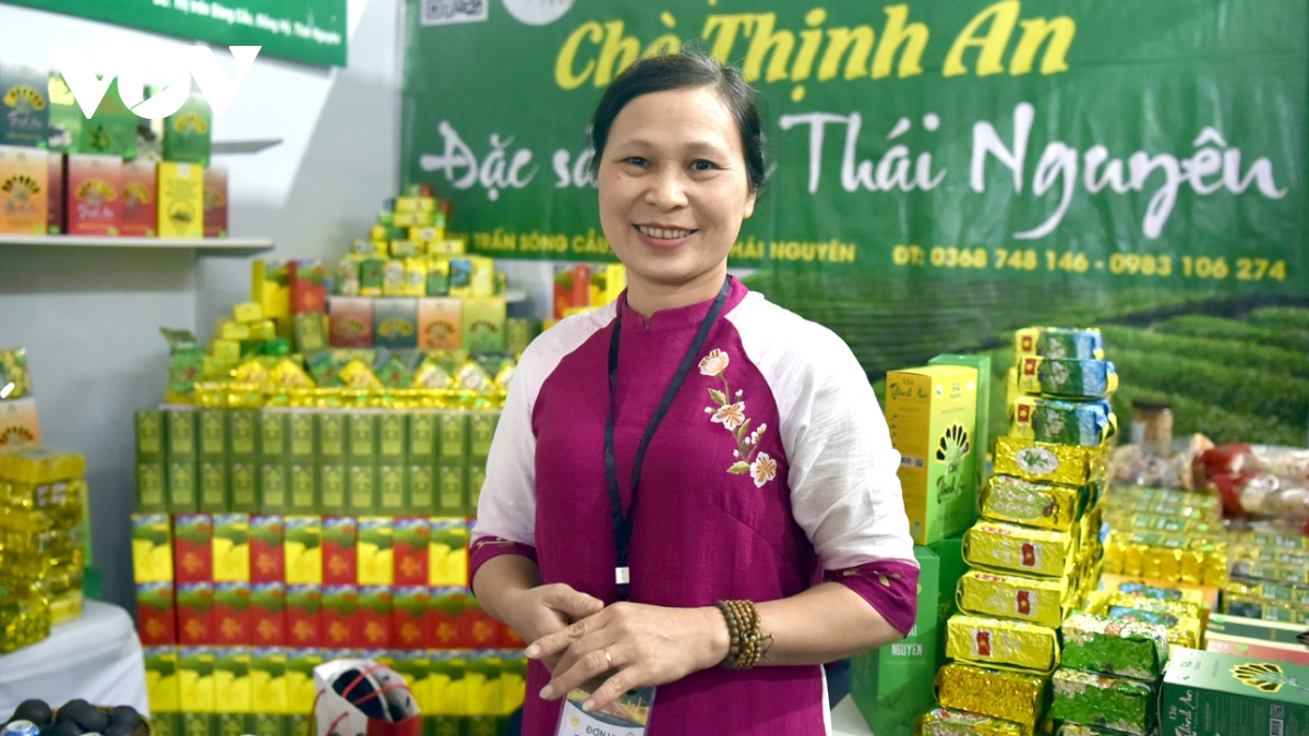 Bà Vũ Thị Thu Huyền, Giám đốc HTX Chè Thịnh An (Thái Nguyên) tại gian hàng Hội chợ Mùa Thu lần thứ nhất - 2025