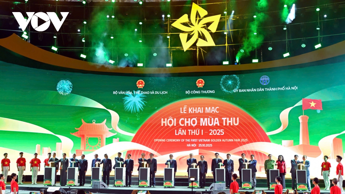 VOV.VN - Tối 25/10, tại Trung tâm Triển lãm Việt Nam (VEC), Hà Nội, lễ khai mạc Hội chợ Mùa Thu lần thứ nhất - 2025 đã chính thức khai mạc. Hội chợ do Bộ Công Thương chủ trì, phối hợp với Bộ Văn hóa, Thể thao và Du lịch, UBND TP Hà Nội cùng các Bộ, ngành và địa phương tổ chức.