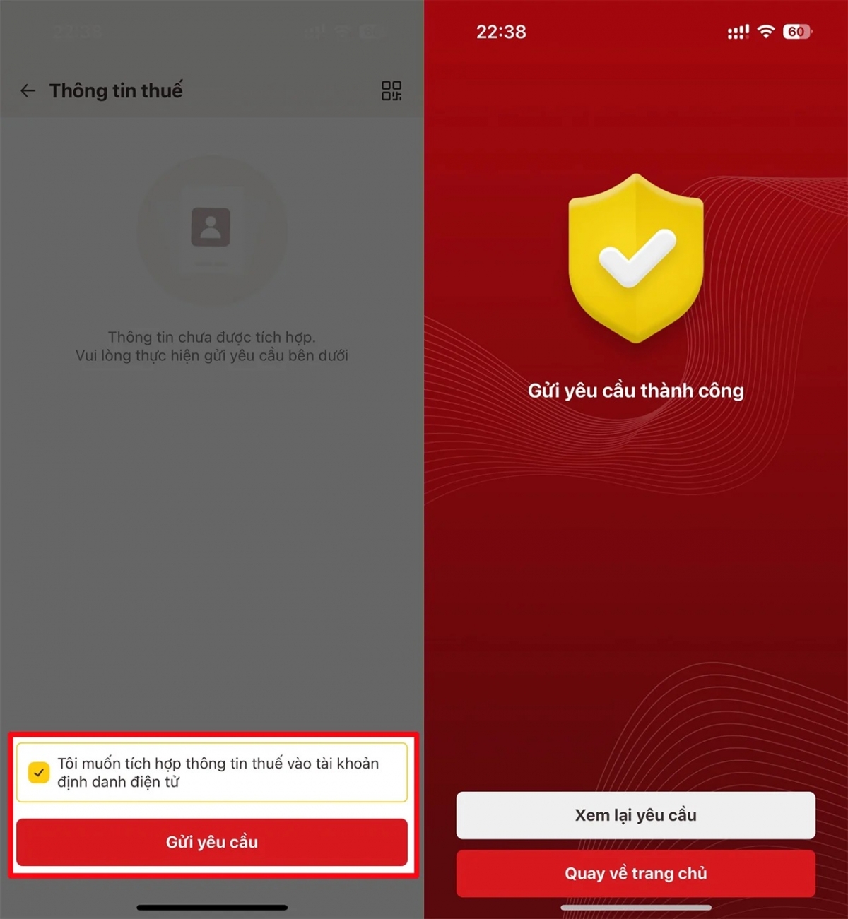 * Bước 3: Tích chọn vào ô xác nhận “Tôi muốn tích hợp thông tin thuế vào tài khoản định danh điện tử” và nhấn Gửi yêu cầu