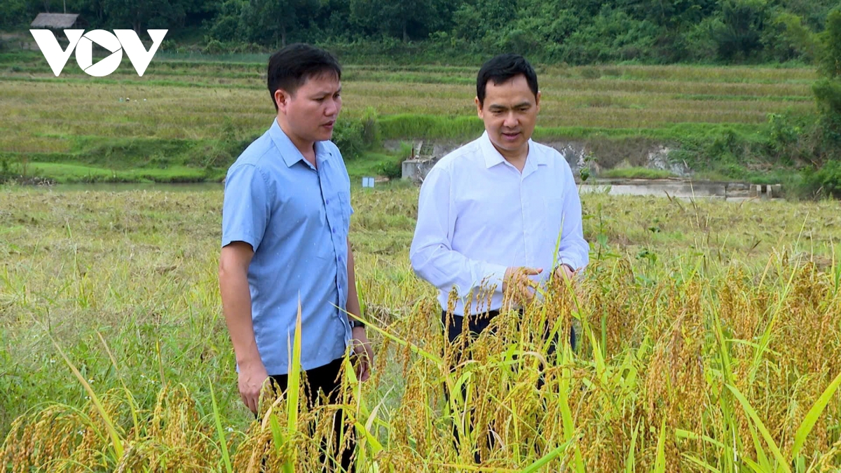 Bí thư Đảng ủy xã Triệu Minh Xiết (áo trắng bên tay phải) đi thăm cánh đồng nếp Cay Nọi của bà con, động viên người dân thu hoạch và kiểm tra những thửa ruộng đang phục tráng giống lúa đặc sản.