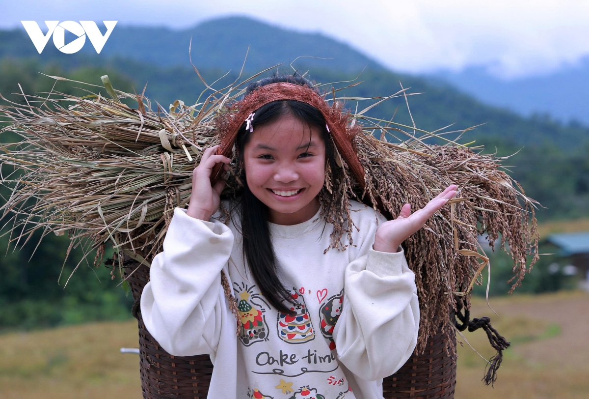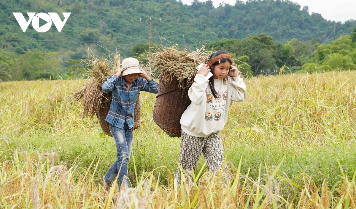 Em Ngân Thị Bảo Nguyên (15 tuổi, học lớp 9) tranh thủ ngày nghỉ học cùng cha mẹ gặt nếp. Bên cạnh, Vi Bảo Huy (học lớp 7) dù nhỏ tuổi vẫn gùi những bó lúa vàng óng phụ giúp gia đình.