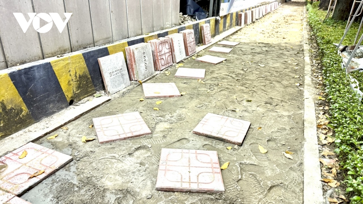 Sau khi lật vỉa hè lên, những viên gạch đầu tiên được chỉnh sửa lại