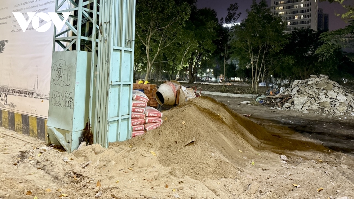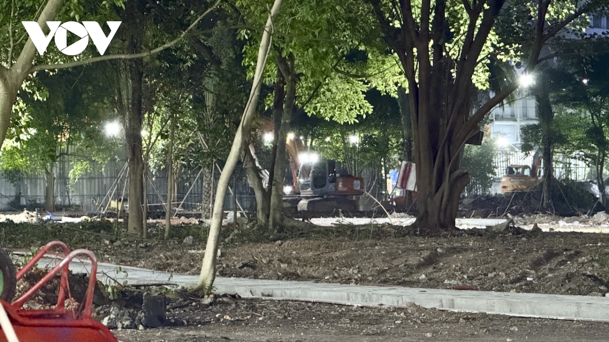 Dưới ánh đèn pha công suất lớn, máy xúc liên tục hoạt động xuyên đêm, từng mảng xà bần, đất đá cũ được dọn đi, mở đường cho không gian xanh sắp xuất hiện giữa lòng đô thị.
