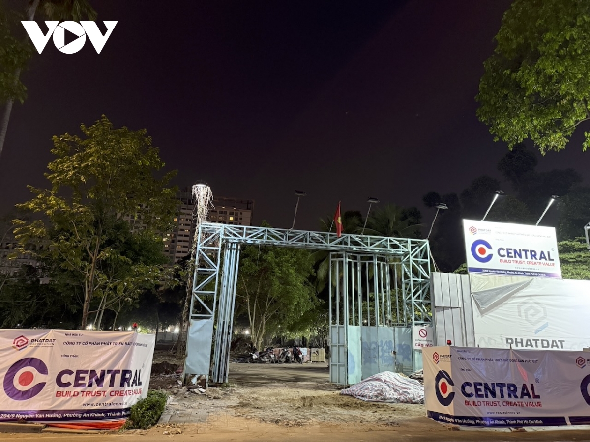 Giữa đêm khuya, khu đất rộng hơn 14.000m² tại ngã tư Pasteur – Võ Văn Tần bất ngờ bừng sáng như một đại công trường, hé lộ những hình ảnh đầu tiên của vườn hoa trung tâm TP.HCM đang gấp rút thành hình trước thềm Tết.
