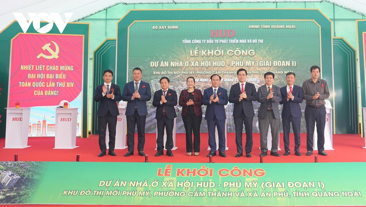 VOV.VN - Tổng công ty Đầu tư phát triển nhà và đô thị (HUD) vừa tổ chức khởi công xây dựng giai đoạn 1 - dự án nhà ở xã hội HUD - Phú Mỹ thuộc Khu đô thị mới Phú Mỹ tại phường Cẩm Thành và xã An Phú, tỉnh Quảng Ngãi.