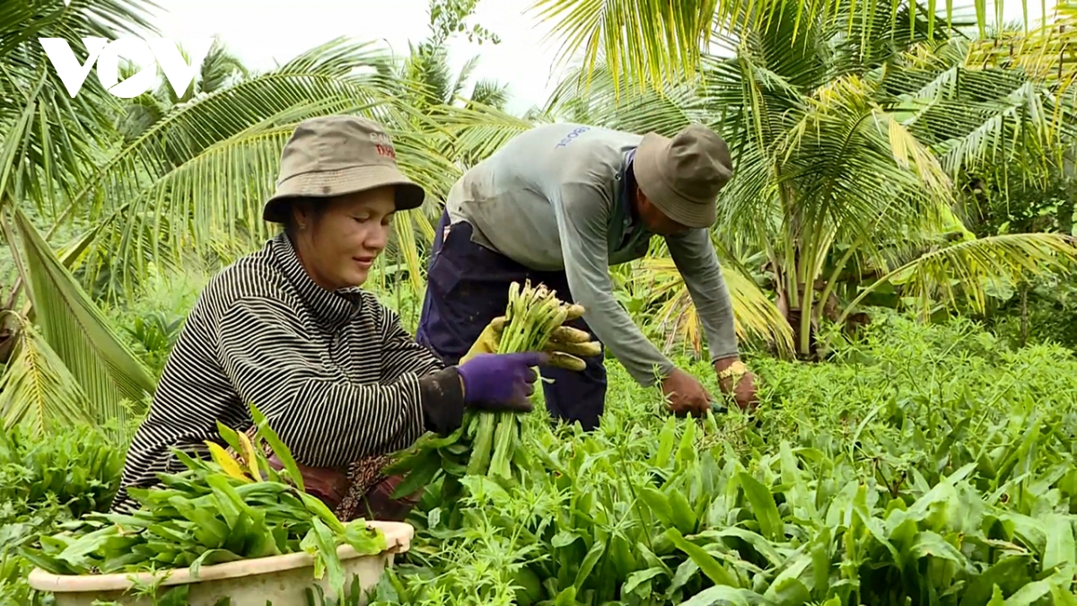 Vợ chồng anh Thạch Ra, xã Tiểu Cần, Vĩnh Long thu hoạch rau gò gai (mùa tàu) trồng xen dừa