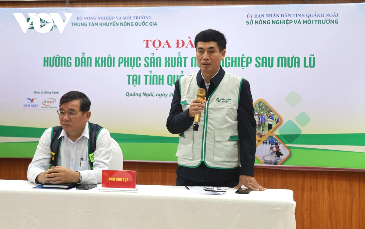 Ông Hoàng Văn Hồng, Phó Giám đốc Trung tâm Khuyến nông Quốc gia cho biết, tại tỉnh Quảng Ngãi, chương trình khôi phục sản xuất tập trung vào 3 nội dung chính là: hướng dẫn tiêu độc, khử trùng chuồng trại, phòng chống dịch bệnh và tái đàn; khôi phục nuôi trồng thủy sản sau bão lũ; xử lý và chăm sóc cây trồng, đặc biệt là cây ăn quả bị ngập.