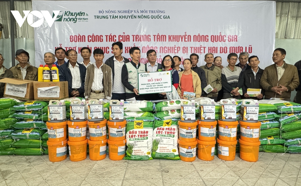 Trung tâm Khuyến nông Quốc gia cũng phối hợp với các công ty, doanh nghiệp trao tặng cho tỉnh Quảng Ngãi 3 tấn phân bón NPK; 100 lít phân bón lá nano; 150kg và 150 lít men vi sinh xử lý môi trường ao nuôi và 32 lít hóa chất sát trùng chăn nuôi để hỗ trợ cho các hộ dân bị ảnh hưởng, thiệt hại.